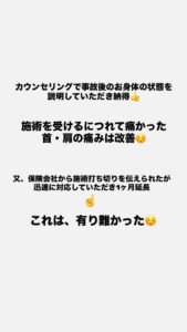 また、施術の打ち切りも言い渡されましたがそれもサポートさせていただき1ヶ月延長してもらいました。