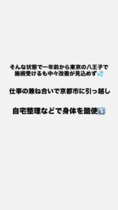 この方は元々、東京 八王子市の整体で1年間施術を受けれるも中々改善が見込めない状態で京都市に引っ越し💨